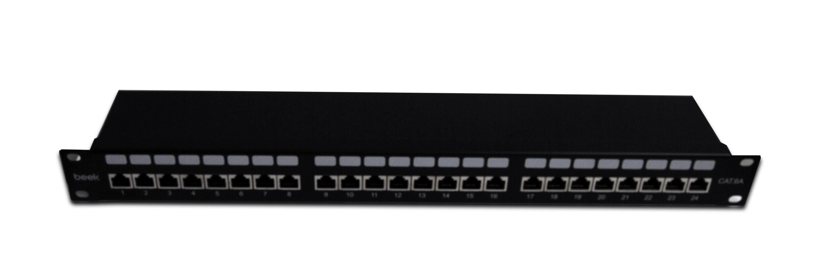 Beek 19" 1U 24 port CAT6A STP Patch Panel, LSA/IDC 90 derece punch ISO11801 Class Ea<br> Beek 19" 1U CAT6A STP Patch Panel, LSA/IDC 24-port 90 degree punch ISO11801 Class Ea