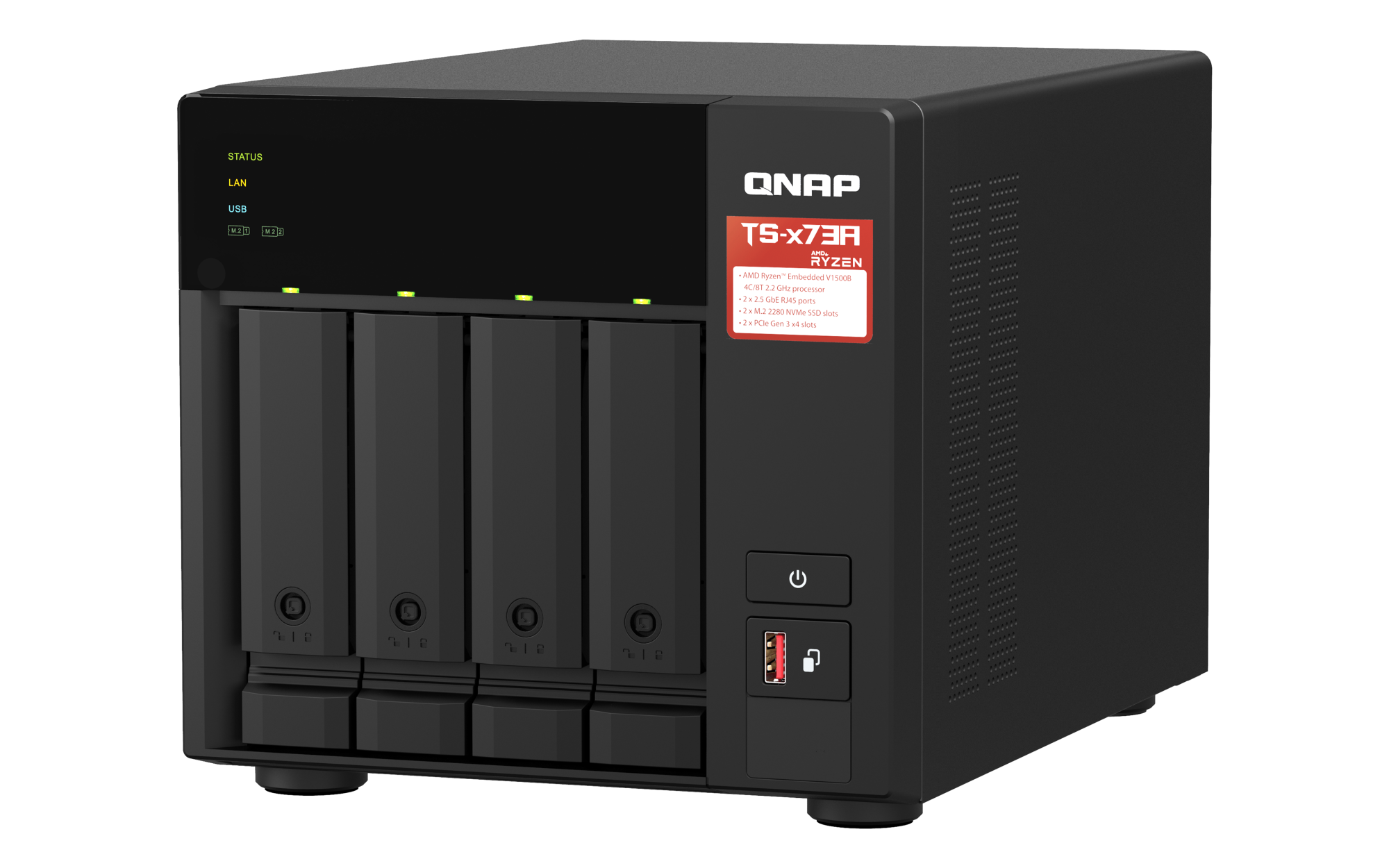 AMD Ryzen™ dört çekirdekli 2.2 GHz işlemci, 2.5 GbE bağlantı, M.2 NVMe SSD ve PCIe genişletme desteği ile 10 GbE yüksek hızlı bağlantı ve M.2 SSD ekleme olanağı; daha fazla esneklik için QTS ve QuTS hero çift işletim sistemi.